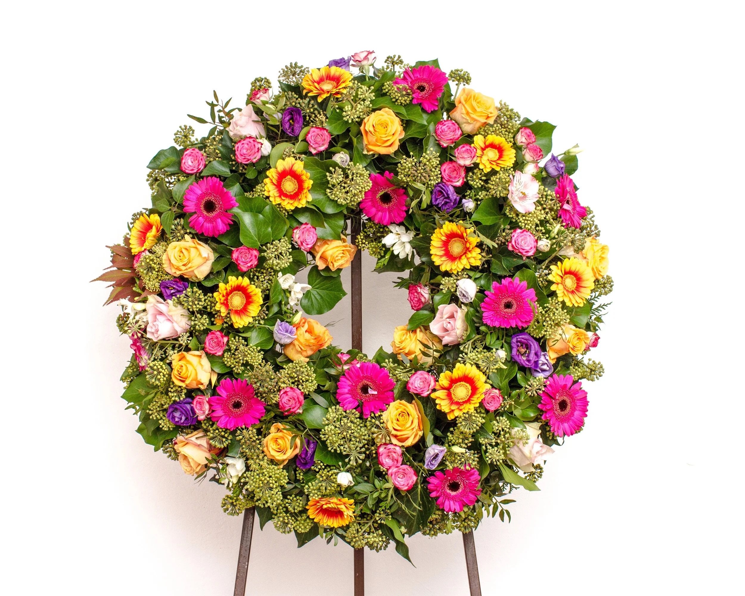 Een cirkel of hart met symboliek. Van subtiel tot rijk gevuld – in de lievelingskleuren of met specifieke bloemen die herinneren.
